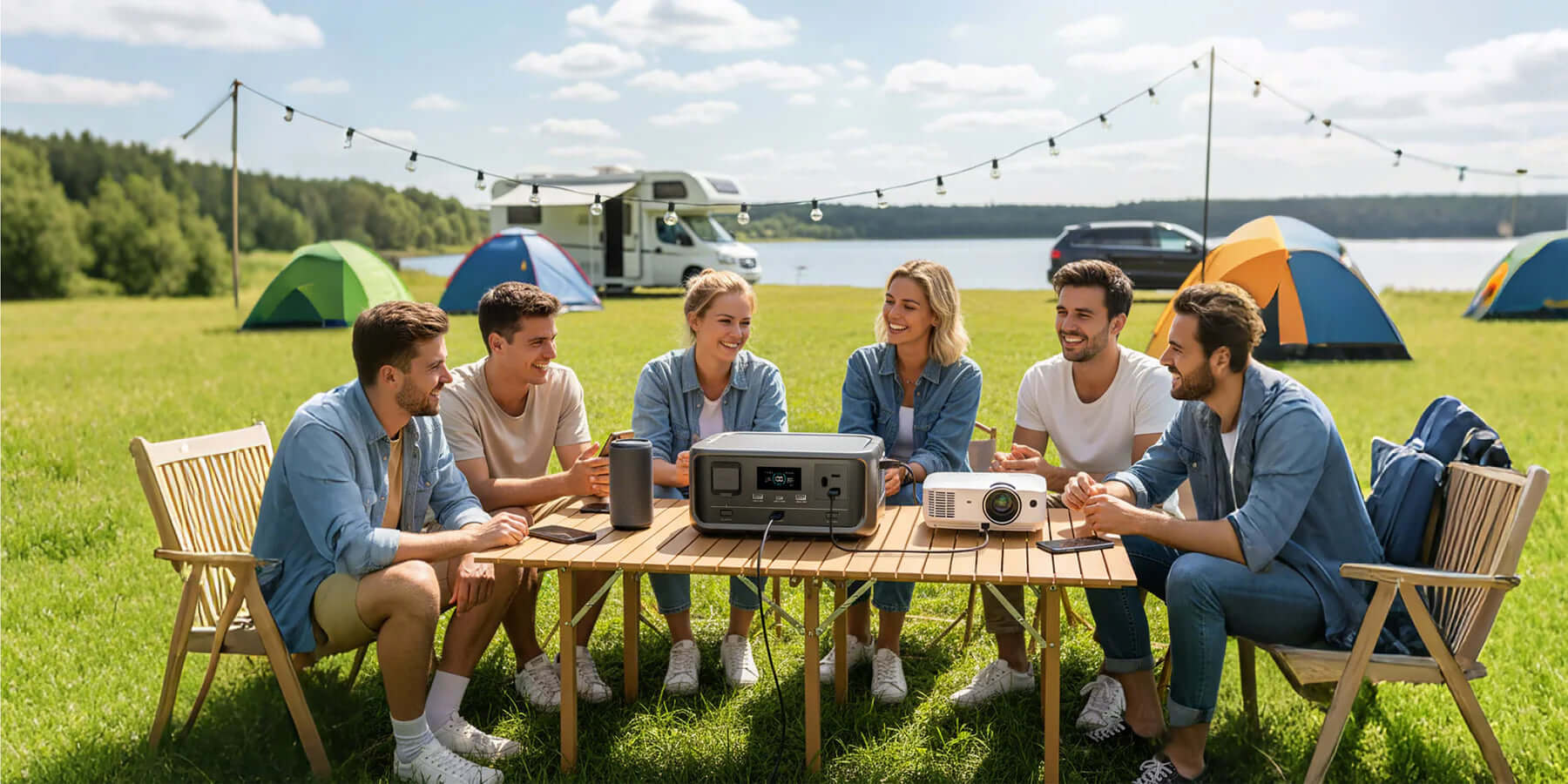 Mesmo ao ar livre, mantenha-se conectado. A nossa estação de carregamento de 2500W vem com um carregador solar silencioso, permitindo que as suas decorações festivas e celebrações funcionem durante 3 dias.