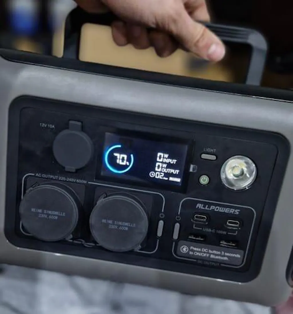A estação de energia portátil ALLPOWERS possui 2 tomadas CA (220 V-240 V 600 W, 1200 W de pico), 2 portas USB-C, 2 portas USB-A, 1 isqueiro de carro (12 V/10 A) e um carregador sem fios de 15 W. Com uma potência de até 600 W, o gerador para exterior ALLPOWERS R600 foi especialmente concebido para carregar chaleiras, sumos, computadores portáteis, frigoríficos para automóveis, drones e outros aparelhos eletrónicos para exterior, alimentando as suas aventuras ao ar livre sem preocupações.