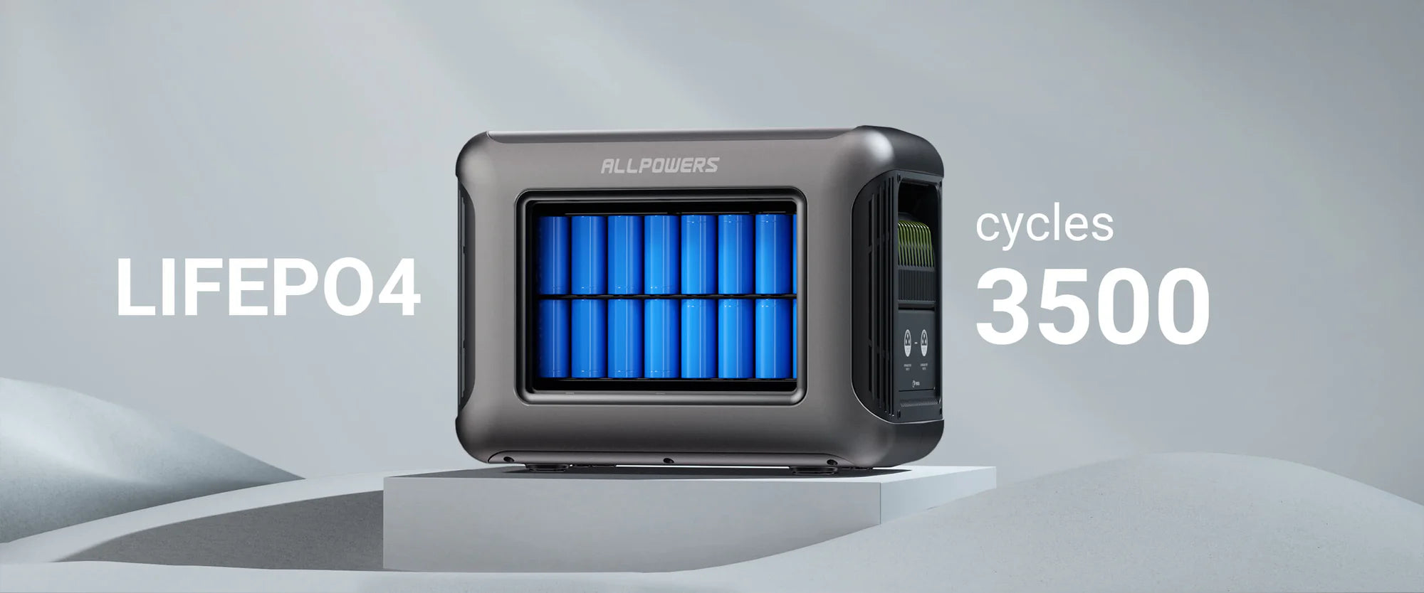 O R1500 está equipado com uma excelente bateria de fosfato de ferro e lítio. Devido à baixa densidade energética, é mais pesada do que as baterias ternárias de iões de lítio, mas tem excelentes tempos de ciclo. Graças à nossa tecnologia exclusiva, o número de ciclos de vida do ALLPOWERS R1500 ultrapassa os 3500. Mesmo com uso diário, durará aproximadamente 10 anos ou mais.