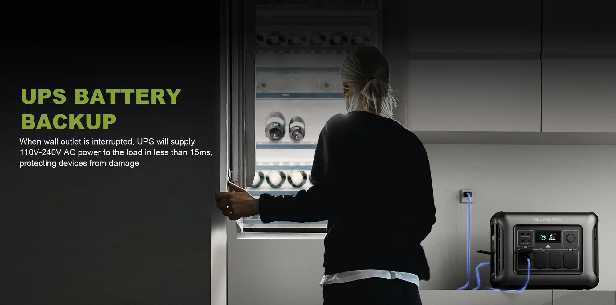 A estação de energia portátil R1500 possui uma fonte de alimentação UPS ininterrupta com um tempo de comutação de 15 milissegundos durante uma falha de energia, protegendo os seus computadores de secretária, servidores de ficheiros e outros dispositivos sensíveis contra perda ou danos nos dados. E quando não há ninguém em casa, no caso de uma falha repentina de energia, o fornecimento normal de energia para CPAP, suprimentos de aquários, frigoríficos, armários de vinho, etc. pode ser garantido por um longo período.