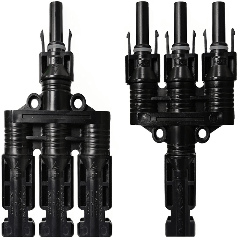 - T Branch parallel Connectors - 1 male to 3 female(M/FFF) and 1 female to 3 male(F/MMM),solar triple connector. Great for parallel connection of up to 3 solar panels.