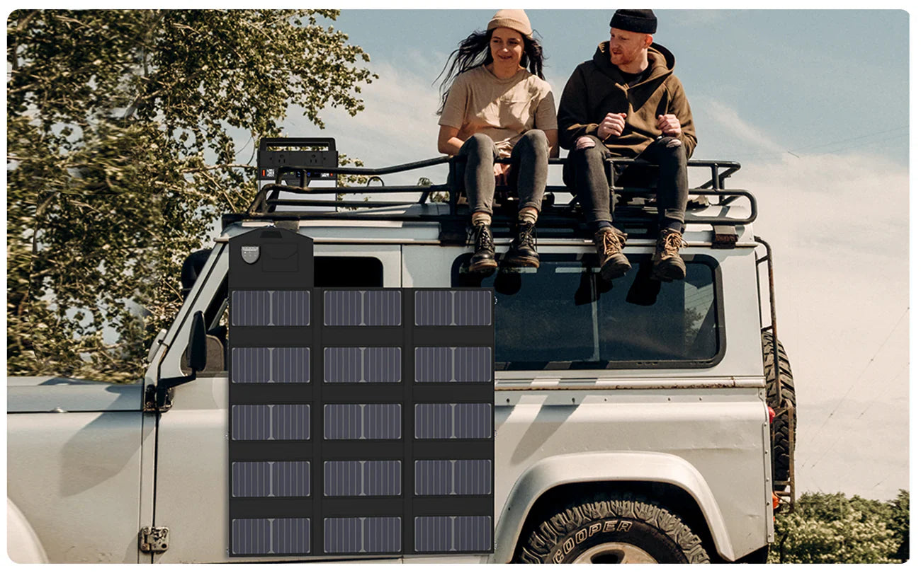 Quando dobrado, o design portátil e com estrutura é adequado para utilização no exterior, no interior, em viagens, campismo e roulottes, sem ocupar espaço. Os orifícios para olhais facilitam a fixação do painel solar portátil à mochila durante a viagem.