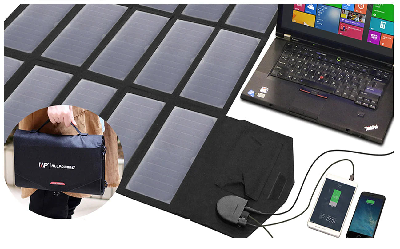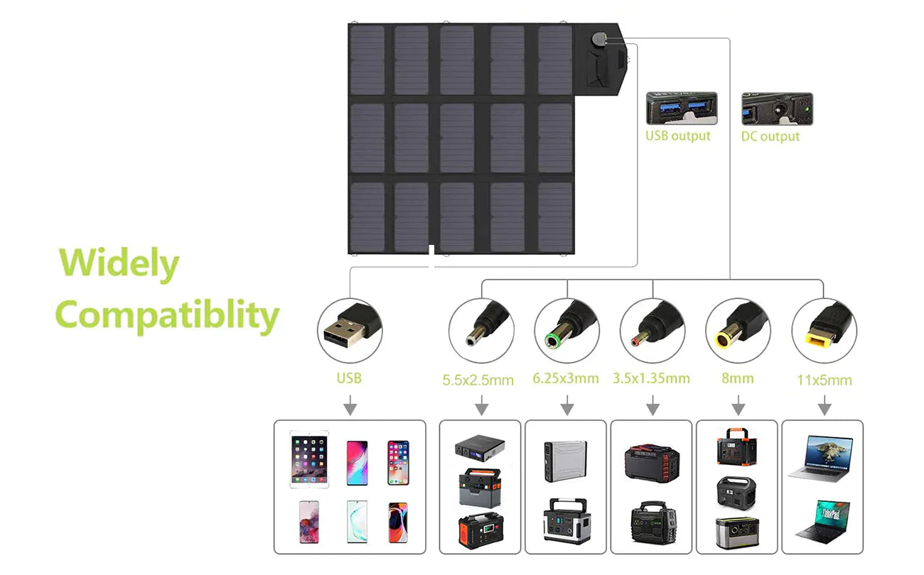 Equipado com saída USB dupla, o painel solar de 100 W é altamente compatível com telefones, iPads e outros dispositivos. Também pode ligar a estação de energia portátil ALLPOWERS S200/S300/S700.